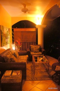 Photo above: Our outside living room during the evening. From here we have a great view over the rain forest below and the sea in the distance. In the picture you can see the sitting area, but the terrace is really big, having a dining table and most essential a hammock 🙂